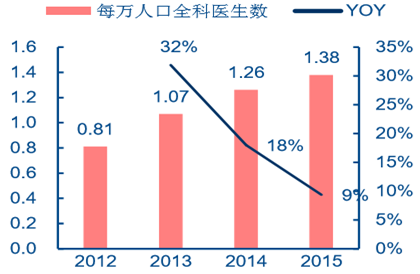 數據顯示 2015 年我 國每萬人全科醫生數目為 1.38 人,較 2012 年的 0.81 人增加約 70%,占醫生群體的比例也 從 2012 年的 4.2%上升至 2015 年的 6.2%,雖然與政策提出的 2020 年達到每萬名居民有 2-3 名合格的全科醫生目標(按照 2020 年我國人口 14 億人估算,我國需要約 28-42 萬名全 科醫生)相比,還有 9-23 萬人的差距。但考慮到“5+3”培養模式提出至今僅有 5 年,而全 科醫生的培養周期較長,因此很多全科醫學專業的醫學院學生尚未走出校門(調查結果顯示 目前僅有 35%的全科醫生經歷了全科醫師規范化培訓,其他主要由內科等科室轉崗而來)。隨著“5+3”培養模式效果的逐步體現,全科醫生的人數有望穩步提升。