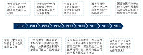 1988 年,世界家庭衛生組織(WONCA)首次將全科醫學引入中國;1993 年,中華醫 學會全科醫學分會的成立,標志著我國全科醫學學科誕生;1997 年,《中共中央、國務院關 于衛生改革與發展的決定》提出了“加快發展全科醫學,培養全科醫生”的任務,也是國家首 次將培養全科醫生提升到了戰略高度。