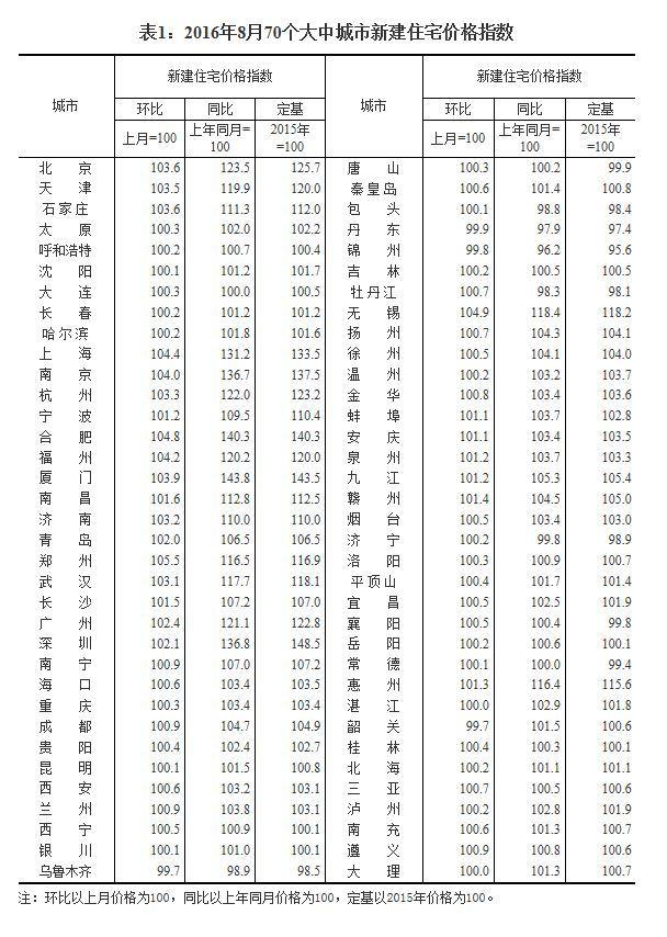 (二)與上年同月相比,70個大中城市中,價格下降的城市有6個,上漲的城市有62個,持平的城市有2個。8月份,同比價格變動中,最高漲幅為44.3%,最低為下降3.8%。