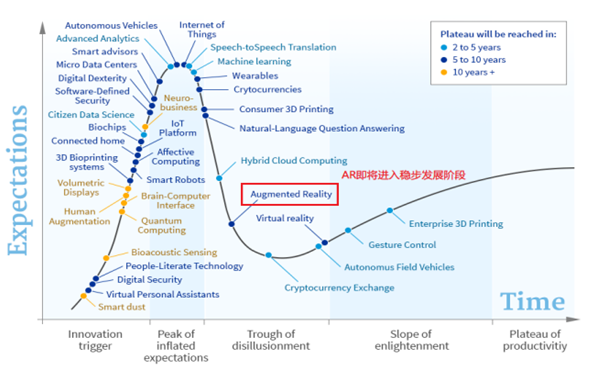 2016 年年初發布的《全球穿戴式設備銷售量預測》報告(Forecast: Wearable Electronic Devices, Worldwide, 2016),對 AR/VR 技術發展持樂觀態度,并預估 2016 年 AR/VR 頭戴顯示設備出貨量將達 140 萬臺,相比 2015 年增長約十倍。同年 7 月,Gartner 公布 2016 年新興技術成熟度曲線,AR 技術在經歷概念炒作階段之后,現已進入商業化之前 的沉淀期。