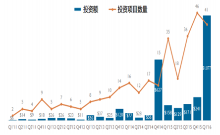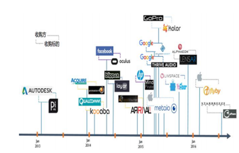 自 2013 年以來,AR 行業收購事件頻發。以谷歌、Facebook、高通等為代表的 IT 龍頭 企業紛紛利用資本力量將具有可觀前景的初創公司收購,并在 2015 年達到一個高峰。從投 資額度來看,根據 CB Insights 的統計數據顯示,2016 年一季度全球 AR/VR 行業投資總額 達 10.8 億美元,創下歷史新高。照現有趨勢,全行業的技術整合、資本整合將持續進行, 龍頭企業紛紛拋出“大手筆”的背后預示著行業爆發期即將到來。