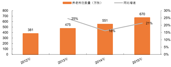 以養老床位數為例,雖然養老床位數一直在上升,但仍達不到規劃目標。民政部數據顯示,截至 2014 年底,全國有各類養老服務機構和設施 11.6 萬個,各類養老床位 551 萬張,比上年增長 16%(每千名老年人擁有養老床位 30 張,比上年增長 11%),其中社區留宿和日間照料床位 298 萬張。2015 年養老床位數增加到了 670 萬張,但相比‚“十二五”的規劃目標依然存在 300 多萬的缺口。