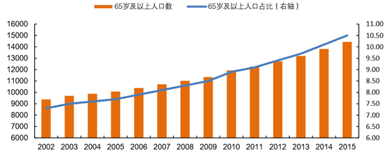 截至 2015 年,我國 65 歲及以上人口數量達到 1.38 億,占比超過 10%。我國已經成為世界上唯一 一個老年人口過億的國家。根據全國老齡辦公布的數字,到 2020 年我國老年人口將達到 2.48 億, 占總人口比重將達到 17%。聯合國預測本世紀中期中國將有 5 億人口超過 60 歲,這個數字將超過美國人口總數。
