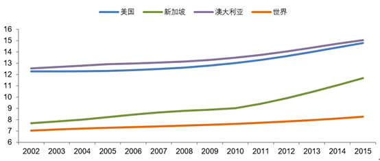 美國、新加坡和澳大利亞 65 歲及以上老年人口占比(%)
