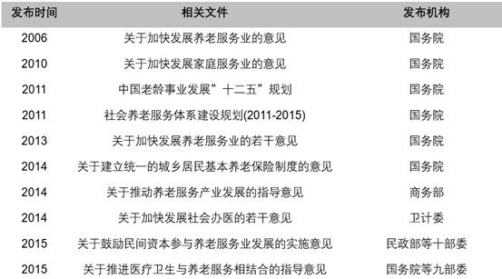 作為健康領域的重要一環,養老產業也將得到更多的政策支持。近幾年,隨著人口老齡化的加劇,國家越來越重視養老產業的發展,針對性的發布一系列政策支持其發展。2015 年民政部等十部委發文鼓勵民間資本參與養老服務產業,國務院等九部委發文推進醫療衛生與養老服務集合的指導意見, 這些政策將對我國養老產業產生深進影響。