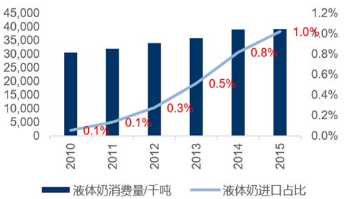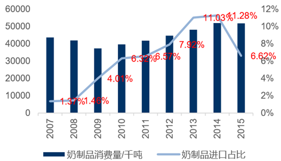 2015 年進口奶制品消費占國內奶制品消費的 6.62%。從進口產品來看,進口全脂奶粉 消費占國內全脂奶粉消費的 17%,進口脫脂奶粉消費占國內脫脂奶粉消費的 82%,進口液 態奶消費占國內液態奶消費的 1%。