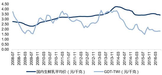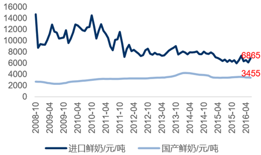 海外進口奶粉 2016 年 6 月到岸價格 1.7 萬元/噸,與國內奶 粉 2.7 萬元/噸相比低 38%,相差約 1 萬元/噸。2008-2016 年進口鮮奶到岸價格與國內主產區的原奶價差在縮窄,但是進口鮮奶價格截止 2016 年 6 月仍高出國內主產區生鮮乳價 格 3445 元/噸。