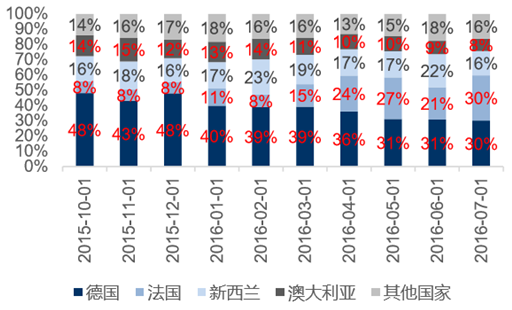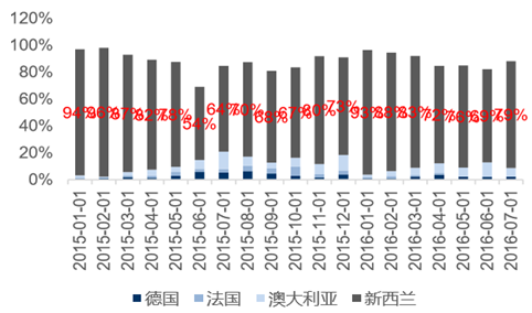 中國從海外進口的奶制品分兩種,一種為原奶,另外一種為加工奶,且進口主要以加 工奶為主。其中,加工奶的主要進口國為新西蘭,2016 年 7 月占比 79%;原奶的主要進 口國為德國、法國、新西蘭、澳大利亞,2016 年 7 月占比 84%,相同區間,單獨統計歐 盟占比 74%。所以我國奶價主要受新西蘭和歐盟奶制品價格影響。
