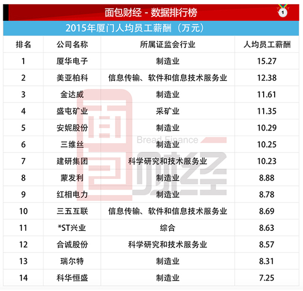 2015年廈門上市的民營企業中,有12家企業員工人均薪酬低于10萬元,人均員工薪酬最低的為新華都,人均薪酬僅為4.56萬元。對于很多三四線城市而言,這樣的薪酬水平并不算太低,但當前廈門的房價早已經躋身一線城市行列。下表為面包財經(微信公眾號:mbcaijing)根據Wind數據以及相關財務準則計算的廈門上市民企人均薪酬: