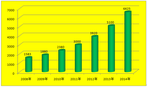 自1998年央行正式批準(zhǔn)開(kāi)展汽車消費(fèi)信貸業(yè)務(wù)以來(lái),該業(yè)務(wù)在我國(guó)實(shí)現(xiàn)了飛速發(fā)展。2001年全國(guó)汽車消費(fèi)信貸余額為436億元,據(jù)人民銀行統(tǒng)計(jì),截至2008年年底,全國(guó)各金融機(jī)構(gòu)共發(fā)放汽車消費(fèi)貸款余額1583億元,截至2011年年底,汽車金融消費(fèi)金融市場(chǎng)余額已突破3000億元。2012年汽車金融發(fā)展速度超過(guò)了30%,達(dá)到3920億元。2014年我國(guó)汽車金融行業(yè)市場(chǎng)規(guī)模約6625億元。近幾年我國(guó)汽車金融行業(yè)市場(chǎng)規(guī)模情況如下圖所示: