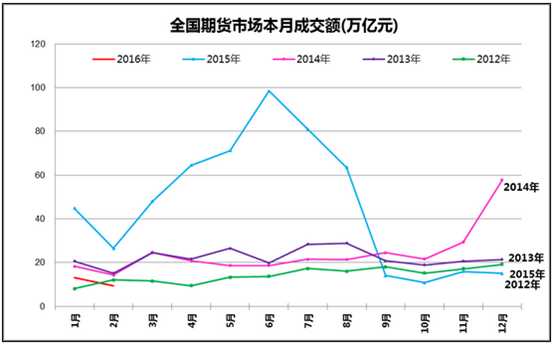 2011-2016年全國期貨市場成交額月度變化