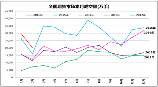 2016年前2個月全國期貨市場累計成交量為4.99億手,累計成交額為22.67萬億元,同比分別增長18.23%和下降68.21%。2月全國期貨市場成交量為2.02億手,成交額為9.47萬億元,同比分別增長26.57%和下降64.33%,環比分別下降31.98%和28.19%。2月份當月的成交額指標創出2011年2月以來新低,成交量水平仍屬正常范圍內,主要原因是金融期貨不活躍和商品價格普遍還處在底部。