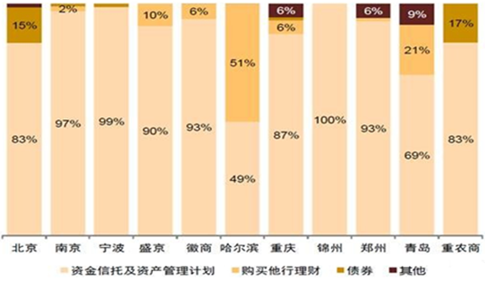 上圖中“投資”類資產包括債券投資、應收款項投資等,是同業業務主流。應收款項類投資中包括信托公司信托計劃、證券公司及保險、基金子公司資產管理計劃及其他商業銀行發行的理財產品的投資。從下圖可以看出,除哈爾濱銀行外,其他10家銀行都以信托、資管計劃投資為主流,只有缺少此類資產配置的銀行才會以購買他行理財產品為補充。