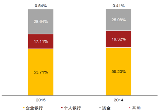 2015年中國經濟持續放緩,央行執行寬松的貨幣政策,市場流動性保持寬松,受利率市場化影響,息差收窄。11家銀行平均利潤增長17.82%,雖然遠遠領跑大中型銀行,但各家行差異較大,五家增速加快,六家放緩。從收入結構看,雖然企業銀行仍然占最大部分,但隨著各家行不同板塊差異化戰略的實施,資金同業業務占比明顯上升。