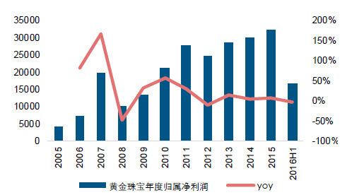 2005-2016H1 黃金珠寶行業凈利潤及其增速