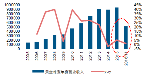 2005-2016H1 黃金珠寶年度收入水平及其增速(單位:萬元)
