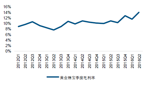 2012Q1-2016Q2 黃金珠寶季度毛利率水平