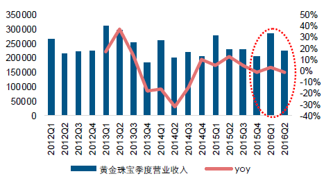 核心提示:黃金珠寶受高基數等因素影響,收入增速下滑,毛利率迎來低位改善。2016H1 黃金珠寶收入同比增長1.16%,增速同比下降7.61 個百分點。2016Q2 黃金珠寶營業收入同比下降1.11%,增速同比下降14.03 個百分點,環比下降4.16黃金珠寶受高基數等因素影響,收入增速下滑,毛利率迎來低位改善。2016H1 黃金珠寶收入同比增長1.16%,增速同比下降7.61 個百分點。2016Q2 黃金珠寶營業收入同比下降1.11%,增速同比下降14.03 個百分點,環比下降4.16 個百分點。黃金珠寶收入下滑主要原因在于一方面2015 年黃金珠寶收入增速較快帶來的高基數,另一方面黃金珠寶企業外延并購轉型效果尚未顯現,收入增長暫時缺乏新的推動力。