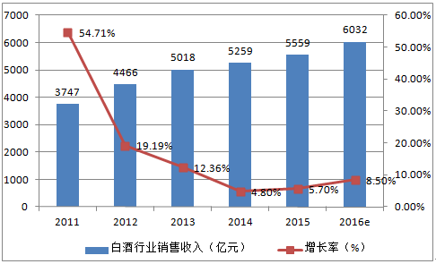 2011-2016年白酒行業銷售收入及增長趨勢