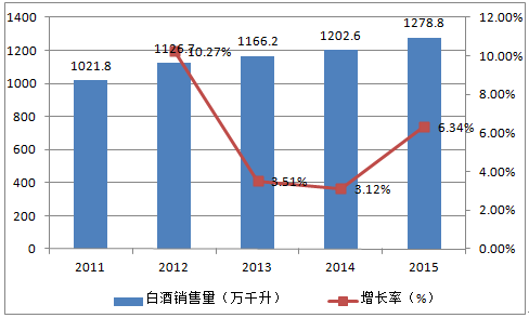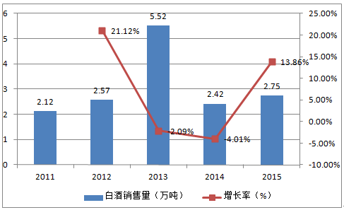 2011-2015年中國白酒銷量變動趨勢