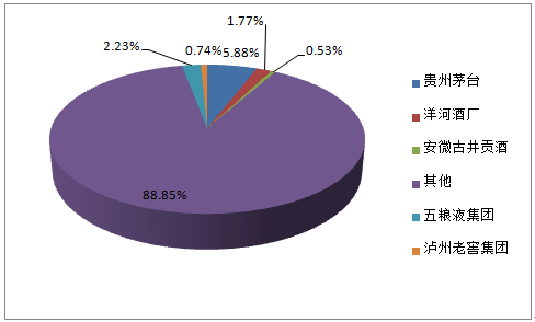 2015年,中國白酒行業上市公司的市場占比分別是:貴州茅臺占比5.88%,位列第一。其次,五糧液集團2.23%、洋河酒廠1.77%、瀘州老窖0.74%和安徽古井貢酒0.53%。