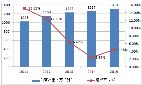 自2014年開始,白酒行業的產銷量增速均結束了連年下跌的局面,實現了微量的反彈。從產銷數據來看,2015年,白酒行業產量達到1313萬千升,同比增長4.46%;與此同時,白酒行業銷量達到1278.8萬千升,同比增長6.34%。白酒產銷數據連續兩年的持續攀升,證明了中國白酒市場供求格局的改變,可以看作白酒行業復蘇的標志。