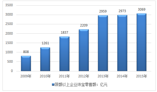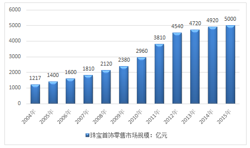 中經先略數據中心發布的《2016-2022年中國質量檢測市場競爭格局及投資前景評估報告》顯示,2014年中國珠寶首飾市場零售額4920億元,2015年我國珠寶首飾零售市場規模為5000億元。