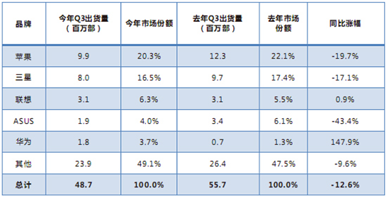 2015年第三季度全球手機市場銷量排行榜數據統(tǒng)計:
