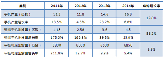 2014年,我國智能手機出貨量達到4.5億部,同比增長25.0%;平板電腦出貨量為6850萬臺,同比增長5.4%。產業(yè)總體向好,產銷量保持快速增長,但增速放緩,結束了高速增長期。