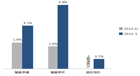經過近年的發(fā)展,已經面世的比較成熟與典型的可穿戴設備包括智能眼鏡、智能手表、智能手環(huán)等。根據騰訊ISUX用戶研究中心5月份的調出結果,目前智能穿戴設備市場增長點主要來自智能手環(huán)、智能手表和運動相機。