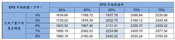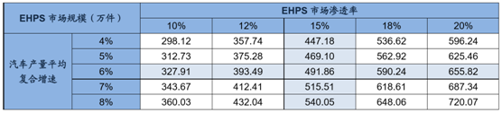 在國內(nèi)汽車產(chǎn)量復(fù)合增速為6%、EPS滲透率為65%的中性假設(shè)下,2020年汽車 產(chǎn)量有望達到3279萬輛,相應(yīng)的EPS市場規(guī)模為2131.41萬件,若按照EPS單價為 1000元/件計算,EPS市場空間有望達到213億元;在國內(nèi)汽車產(chǎn)量復(fù)合增速為6%、 EHPS滲透率為15%的中性假設(shè)下,2020年EHPS的市場規(guī)模為491.86萬件,若按照 EHPS單價1200元/件計算,EHPS未來市場空間有望達到60億元。
