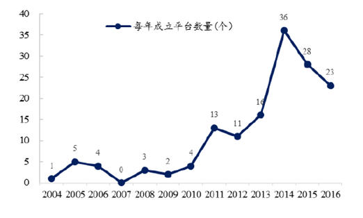 2004 年-2016 年中國直播領域每年成立平臺數量(截至2016.05)
