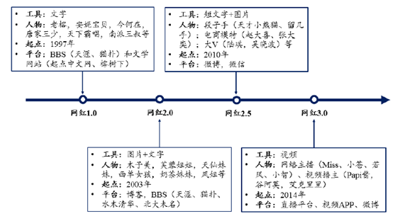 網紅的發展經歷了四個階段,隨著網絡技術的飛速進步,網紅與粉絲交互內容也從原先的文字、圖片等形式過渡到了以視頻、直播為主流的新時代,當前新晉網紅以后兩者為主。尤其是在網絡直播大行其道之下,絕大部分微博大V、視頻播主開始試水網絡直播,成為與粉絲互動新的方式。