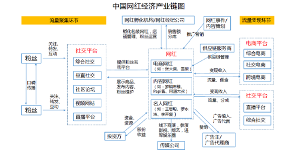 隨著網紅產業規模的不斷壯大,在資本的介入下整個產業鏈條逐漸正規化、復雜化,結束起步階段單兵作戰的簡單模式,使得整個網紅經濟產業鏈各個環節分工更為明確,整個產業網紅經濟產業鏈以網紅為核心環節,經由上游的流量聚集和下游的流量變現,實現網紅經濟的產業化發展。因而在這樣的發展趨勢下,網紅想要實現自身價值的最大化,單槍匹馬已經難以為繼。
