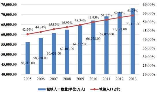 改革開放以來,伴隨著工業化進程加速,我國城鎮化經歷了一個起點低、速度快的發展過程。1978-2013 年,城鎮常住人口從1.7 億人增加到 7.3 億人,城鎮化率從 17.9%提升到 53.7%,年均提高 1.02 個百分點;城市數量從 193 個增加到658 個, 建制鎮數量從 2,173個增加到20,113 個。 根據國家統計局統計數據, 2005年至 2013 年城鎮人口數量的年復合增長率為 3.34%,預計到 2030 年,城市化率將達到 65%。