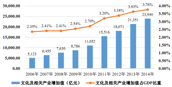 黨的十六大以來,隨著文化體制改革的深入推進,合格文化市場主體數量不斷增多,社會各方面投入文化產業的熱情高漲,各項扶持政策不斷出臺,我國文化產業正進入發展的黃金期,文化產業增加值逐年提升。“十一五”時期是我國文化創意產業發展速度最快,產業規模迅速擴大的時期。2011 年,文化產業總產值超過3.9萬億元, 占GDP比重超過3%2。 據 《中國文化產業年度發展報告 (2013) 》數據顯示,文化及相關產業 2012 年增加值達到了 18,071 億元,占 GDP 比重3.48%。2013 年我國文化產業增加值為 21,351 億元,與 GDP 的比重為 3.63%,經國家統計局核算,2014 年全國文化及相關產業增加值 23,940 億元,比上年增長 12.1%(未扣除價格因素),比同期 GDP 現價增速高 3.9 個百分點;占 GDP的比重為 3.76%,比上年提高 0.13個百分點。核算數據表明,文化及相關產業在穩增長、調結構中發揮了積極作用。