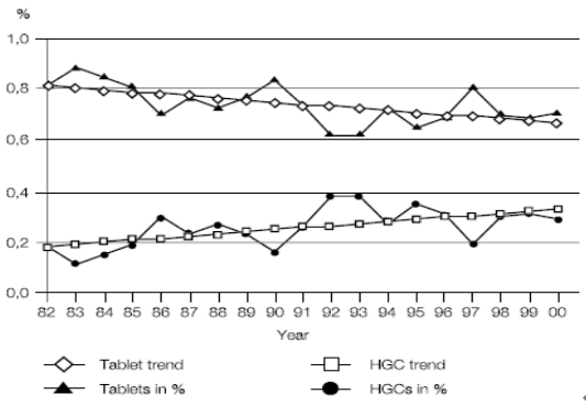 注: Tablets in %和Tablet trend分別表示片劑占比及其變動趨勢, HGCs in %和HGC trend分別表示硬膠囊劑占比及其變動趨勢。