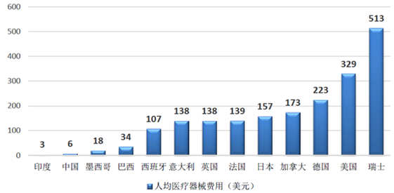 從人均醫療器械費用來看,我國目前醫療器械人均費用僅為6美元/人,而主要發達國家人均醫療器械費用大都在100美元/人以上,瑞士更是達到驚人的513美元/人。與發達國家相比,中國人均醫療衛生支出尚處于較低水平,未來提升空間巨大。