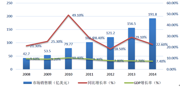 近年來,我國的醫療電子市場需求也不斷增長,已成為僅次于美國和日本的世界第三大醫療電子市場。2014年,我國醫療電子市場銷售額191.8億美元,同比增長22.6%。我國醫療電子市場占全球市場的份額也在不斷擴大,從2008年的不足3%增長到2014年的8.5%。