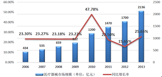 進入21世紀以來,醫療器械產業整體步入高速增長階段,近五年來全國醫療機構數目穩步增長,而且這種趨勢具有一定穩定性,未來幾年將帶來大量的醫療基礎設施投入,醫療器械和器具作為基礎設施的一部分,必然會受益于整個行業擴容所帶來的利好,醫療器械的生產企業也將顯著受益。數據顯示,中國醫療器械行業銷售規模從2001年的179醫院增長到2013年超過2,000醫院,增長近10倍。2004-2014年醫療器械行業收入的符合增速達25%,遠高于全球7%-8%的增速,2014年我國醫療器械行業銷售規模突破2千億元,約占全球醫療器械銷售規模的7%,未來仍有較大提升空間。另根據國家統計局數據顯示,2014年醫藥制造業的銷售收入為23326億元,醫療器械市場規模僅占到醫藥總市場的9.16%,與全球醫療器械占醫藥市場總規模的42%相比,還有巨大發展空間。