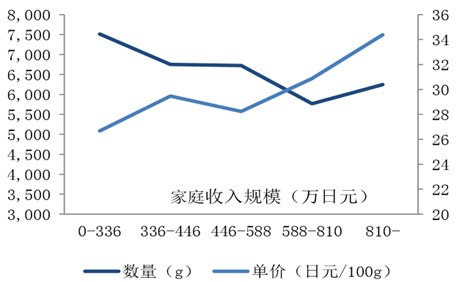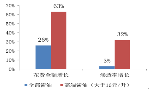 以醬油為例,2014 年我國 醬油整體消費金額增長 26%,滲透率提升 3%,其中高端醬油消費金額增長 63%,滲透率 提升 32%。隨著收入水平提升,消費者價格接受度提升,追求風味更佳的高端醬油,高端 醬油增長更快。比對日本,在調味品需求逐漸飽和后,日本家庭傳統食品消費減少,醬油消 耗量有所降低,但消費醬油的單價隨收入水平提升明顯增加,高收入家庭消費醬油的單價比 低收入家庭貴 30%。