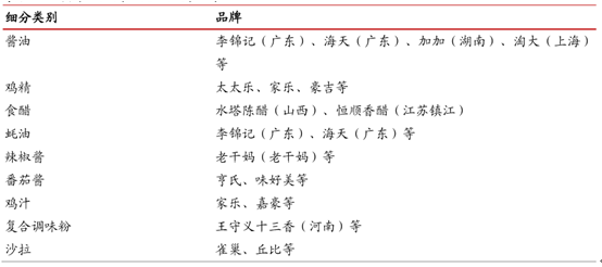 調味品主要品類及主要品牌