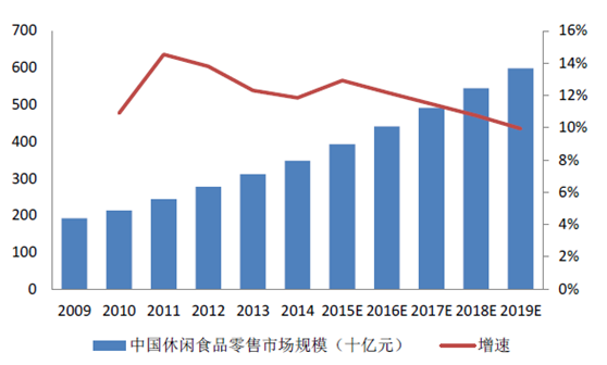 從休閑食品市場(chǎng)規(guī)模來看,2009-2014年我國(guó)休閑食品零售市場(chǎng)規(guī)模年復(fù)合增速為12.67%,15年零售端收入預(yù)計(jì)達(dá)到3931億元,同比增速12.9%;預(yù)計(jì)到2019年我國(guó)休閑食品零售市場(chǎng)規(guī)模將達(dá)到5987億元。