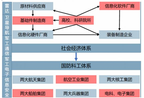 中國(guó)軍工體系分為國(guó)防科工體系和社會(huì)經(jīng)濟(jì)體系,兩大體系相互融合助推國(guó)防 信息化產(chǎn)業(yè)發(fā)展。國(guó)防科工體系主要由十大軍工集團(tuán)組成,負(fù)責(zé)重點(diǎn)軍工型號(hào)的總體研發(fā)和整機(jī)制造,構(gòu)成產(chǎn)業(yè)鏈的下游; 社會(huì)經(jīng)濟(jì)體系由裝備制造企業(yè)、原材料供應(yīng)商、基礎(chǔ)件制造商、高校/科研院所、信息化硬件廠商、信息化軟件廠商組成,構(gòu)成產(chǎn)業(yè)鏈的上游。兩大體系共同實(shí)現(xiàn)了對(duì)雷達(dá)、衛(wèi)星導(dǎo)航、軍工通信、軍工電子及信息安全五大細(xì)分領(lǐng)域的全面覆蓋,助 推國(guó)防信息化產(chǎn)業(yè)加速發(fā)展。