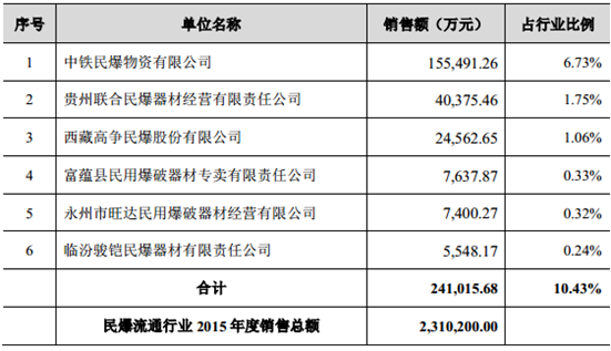 民爆流通企業數量眾多、普遍規模較小。部分相對銷售額較大的民爆器材流通企業 2015 年度的銷售情況如下: