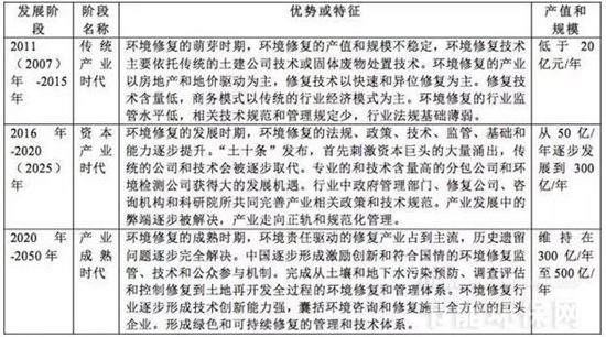 從2016年至2020年,中國的環境修復產業會逐漸發展并健全起來,從2016年的預計值100億元,增長到2020年的300-500億元。從2021年到至至2050年,中國的環境修復產業會到達平穩發展和產業成熟階段,預計中國環境修復總投入會達到1.5萬億至2.5萬億之間。