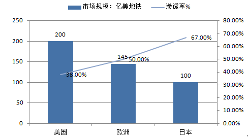 歐美日獨產實驗室市場規模及滲透率(單位:億美元)
