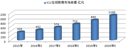 2015年中國K12在線教育市場規模約為359億元。現階段K12在線教育市場需求旺盛、教學模式不斷優化,將呈快速增長趨勢。到2020年,我國K12在線教育市場規模將達1100億元左右,未來五年復合增長率約為25%。