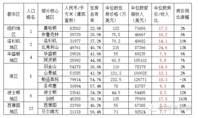 下表是美國(guó)典型區(qū)域的房?jī)r(jià)數(shù)據(jù),第一列都市區(qū)的概念為美國(guó)統(tǒng)計(jì)屬的Combined Statistical Area(CSA)口徑,表示聯(lián)系緊密的city/county組合,大致可以對(duì)應(yīng)為中國(guó)的地級(jí)市/直轄市的范圍,對(duì)于部分聯(lián)系緊密的區(qū)域,也可以合并算作一個(gè)CSA,比如深莞、廣佛、滬昆(山)、京燕(郊)CSA。