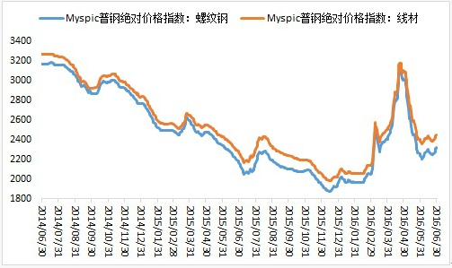 數據顯示,截止2016年6月底,Myspic普鋼絕對價格指數2548.21元/噸,較年初上漲20.09%,較去年同期上漲7.73%;螺紋鋼價格指數2317.92元/噸,較年初上漲15.49%,較去年同期上漲6.83%;高線價格指數2452.83元/噸,較年初上漲17.25%,較去年同期上漲8.01%。上半年建筑鋼材價格波動十分劇烈,尤其是3月份之后,在市場需求釋放及期貨市場看漲氣氛濃厚的雙重拉動下,建筑鋼材價格出現了非理性的瘋狂拉漲,一度破“3”。之后市場出現回調,且由于唐山鋼坯價格大跌以及鋼廠復產帶來的市場供需壓力逐漸加大,5月建筑鋼材價格大幅下跌至去年同期價格之下。6月市場呈現供需弱平衡態勢,建筑鋼材價格持續震蕩。